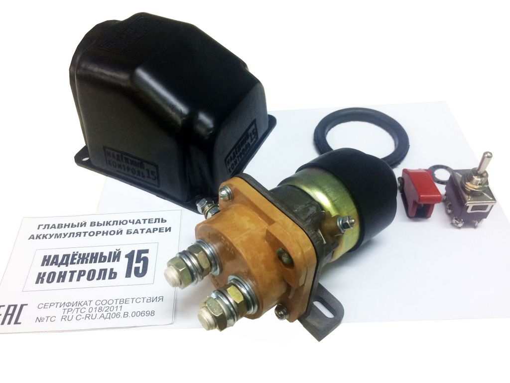 - Главный выключатель аккумуляторной батареи («выключатель массы»). Должен быть установлен как можно ближе к аккумуляторной батарее. Если используется выключатель только по одному полюсу (размыкает только один провод), то выключатель устанавливается на проводе питания («плюсовом» проводе) вне зависимости от даты производства транспортного средства (п. 9.2.2.8.1 ДОПОГ).